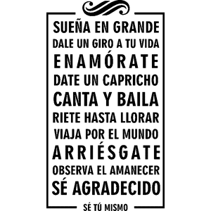 Des stickers muraux citations pour la déco ! Avec les stickers citation et ce sticker Suena en grande dale un giro a tu vida, vous pourrez enfin décorer l'intérieur de votre cuisine à votre guise avec leur aide ! Avec ce sticker Suena en grande dale un giro a tu vida votre salon réfletera élégance