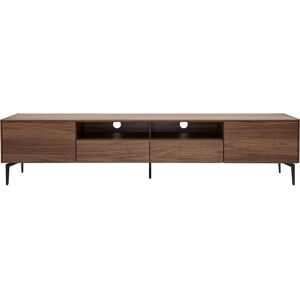 Le meuble TV design BLISS se démarque par ses beaux volumes et ses détails soignés. Ses lignes nettes et essentielles sont représentatives d'un certain minimalisme contemporain. Ce meuble TV réunit dans une parfaite harmonie la chaleur du bois et le caractère du métal. Sa structure en panneaux de fibres de bois replaqués noyer est soutenue par un piètement métallique ultra fin et moderne (H15 cm). La laque transparente apposée sur la structure protège le bois sans modifier son aspect. On ne se lasse pas d'admirer les reflets chauds du noyer, ses multiples noeuds et ses veines marquées. Le meuble TV BLISS renferme de nombreux rangements hautement fonctionnels. Sur son grand plateau (L200 x P40 cm), vous pourrez disposer vos objets déco préférés en plus de l'écran télé. Les deux niches ouvertes avec passe-câbles accueilleront vos box et consoles sans risque de surchauffe tandis que les deux tiroirs et les deux rangements latéraux vous permettront d'organiser et de dissimuler tous les accessoires électroniques qui envahissent le séjour. Pour un intérieur sur mesure, vous pouvez coordonner le meuble TV BLISS avec le buffet de la même collection.Meuble TV design bois foncé noyer et métal noir 2 portes 2 tiroirs L200 cm BLISS livré prêt à assembler.