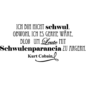 Des stickers muraux citations pour la déco ! Avec les stickers citation et ce Sticker Ich bin nicht schwul - Kurt Cobain, vous pourrez enfin décorer l'intérieur de votre cuisine à votre guise avec leur aide ! Où coller cet autocollant déco ? Ces stickers proverbes d'hommes célèbres seront parfait p