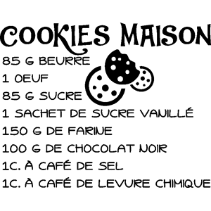Des stickers cuisine pour votre déco ! Avec ce stickers pour la cuisine représentant un Sticker citation recette Cookies maison vous pourrez décorer votre intérieur de manière originale et facile! Vous allez pouvoir donner une nouvelle vie à cette pièce si fréquemment utilisée ! Où coller cet autoc