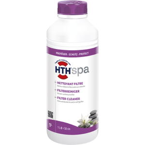 Descriptif de hth Spa nettoyant filtre : détartrage et nettoyage A force de profiter du confort délivré par le Spa, le filtre (à cartouche ou à sable) s'encrasse. L'eau est alors moins bien filtrée et le Spa devient moins agréable. Pour un nettoyage approfondi de votre spa, adoptez hth Spa Nettoyant filtre. Super efficace, le produit détruit même les dépôts calcaires et dispose d'un excellent pouvoir détergent. De coloration violette, hth Spa Nettoyant filtre est facile à l'emploi. Le produit est adapté pour tous les filtres à cartouche ou à sable, sauf filtration à charbon actif. Grâce à hth Spa Nettoyant filtre, faites fonctionner à merveille votre filtre et évitez les eaux troubles ! Très forte teneur en matières actives Dosage standard : 1 litre pour 10 litres d'eau (pour filtre à cartouche) Pour un dosage pratique, la bouteille est graduée. Utilisez les produits chimiques de traitement d'eau avec précaution. Avant toute utilisation, lisez les consignes inscrites sur l'emballage du produit et rendez-vous sur le site officiel du fabricant depuis notre page dédiée à la marque hth®