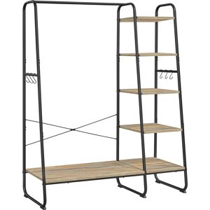 Caractéristiques :- Couleurs : Marron turquoise, noir mat - Matériaux : Panneau d’aggloméré, acier- Dimensions : 45 x 120 x 160 cm (P x L x H)- Poids : 16,6 kg- Capacité de charge statique de la barre de suspension : 40 kg- Capacité de charge statique de chaque crochet : 4 kg- Capacité de charge statique de chaque étagère, de haut en bas : 21,3 kg, 24,9 kg, 27,2 kg, 29,9 kg, 75,3 kg.- Capacité de charge statique totale : 220 kgLivraison :- 1 x Porte-manteau- 1 x Kit de montage- 1 x Mode d’emploi