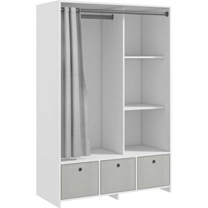Description:Cette armoire de rangement est idéale pour votre chambre ou dressing. Elle vous offrira un grand espace de rangement pour vos vêtements, serviettes de bain, etc. Ses couleurs neutres et sa sobriété en font un meuble qui s'intègre facilement dans tous les intérieurs. Ce meuble de rangement est très pratique avec sa tringle, ses 3 niches, ses 3 tiroirs en tissu amovible et son rideau pour fermer l'ensemble.caractéristique:● Grand espace de rangement avec plusieurs étagères et penderie : idéal pour les vêtements, les serviettes de bain, etc.; ● Dressing penderie à design simple et épuré pour adaptation a tout type de pièce: chambre, dressing, hall d'entrée, etc.; ● 3 niches avec 2 étagères latérales pour ranger des serviettes, vêtements plies et une penderie pour vos chemises, manteaux, etc.; ● Armoire penderie de chambre avec 3 tiroirs en tissu amovibles pour ranger des accessoires ou chaussures; ● Fabriqué en panneaux de particules, cette armoire de vêtement est résistante et fiable pour une utilisation quotidienne; ● Un rideau est inclus pour éviter les dégâts et la poussière; ● La conception surélevée empêche l'humidité; ● Assemblage requis;Spécification:● Couleur : blanc; ● Matériaux : panneau de particules, tissu lin (100%polyester); ● Dim. totales : 105L x 48l x 160H cm; ● Dim. compartiment avec tringle : 60l x 39,5P x 123,8H cm; ● Dim. compartiment droit : 40l x 39,2P x 40H cm; ● Dim. rangemenr interne tiroir : 32,4l x 47,6P x 27H cm; ● Charge max. recommandée : 65 kg (au total), 20 kg (haut), 20 kg (tringle), 10 kg (compartiment), 5 kg (tiroir en tissu); ● Réf. : 831-573V00WT;contenu du colis:● 1 x Meuble Penderie; ● 1 x Notice de Montage;