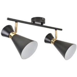 Rampe double applique avec 2 têtes d'éclairage orientables en métal noir et pièces dorées. Double applique murale ou double plafonnier, ce luminaire design est un véritable outil déco pour finaliser l'ambiance de votre cuisine ou votre salon. ---- Coup de coeur déco pour cette rampe 2 lumières qui fera merveille pour éclairer une cuisine moderne ! On aime la forme conique des 2 diffuseurs noirs et les finitions dorées pour une ambiance stylée dans votre déco. On aime aussi les 2 spots orientables qui permettent de mettre en valeur certains points de l'espace. Pour un éclairage design optimal, cette rampe 2 lumière s'installe en éclairage mural ou en plafonnier dans votre cuisine comme dans votre salon. Caractéristiques techniques de la double applique Iron noire : Hauteur : 24,5 cm Profondeur : 22 cm Longueur : 39 cm Poids : 0,80 kg Nécessite 2 ampoules E14 de 25W max. non incluses (voir les ampoules LED E14 proposées par Millumine) Applique double ou plafonnier 2 lumières avec structure en métal noir et 2 diffuseurs noirs en forme de sablier maintenus par une tige et une bague dorée. Chaque diffuseur est orientable de manière indépendante. IP20 - Classe I Garantie 2 ans par le fabricant