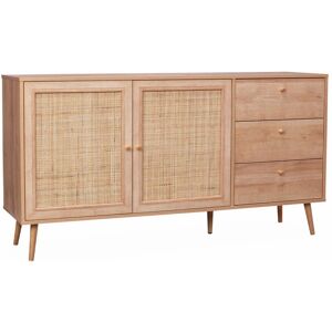 Les + produit :Buffet aux rangements fonctionnelsPiètement boisPieds compas Doté de 2 portes et 3 tiroirs Notre collection Bohème a été pensée pour donner une touche naturelle et vintage à votre intérieur avec des meubles en cannage. Le caractère du décor bois se marie parfaitement avec la simplicité du cannage qui habille les meubles avec élégance. Table basse, meuble de TV, table de chevet... Cette collection vous propose une sélection de meubles de rangement pour aménager votre intérieur tout en légèreté. Avec son charme bohème, ce buffet apportera une touche de légèreté et de pureté à votre intérieur. Ses portes en cannage, sa structure en décor bois et son piètement compas, en font un meuble authentique au style vintage. Equipé de 2 portes et de 3 tiroirs, vous pourrez facilement y ranger votre vaisselle, vos verres et votre linge de table. Pour optimiser le rangement, l'intérieur est divisé en 2 niveaux. Stable et résistant grâce à ses 5 pieds (dont un central), ce meuble vous fera craquer avec toutes ses qualités !Détails du produitCouleur : NaturelMatière : Panneaux stratifiésNombre de portes : 2Nombre de tiroirs : 3Nombre d'étagères : 1Style : CannageType : BuffetUsage : usage domestique uniquementMatière du plateau : Panneaux stratifiésGarantie : 2 ansCaractéristiques Panneaux : Panneaux stratifiésPortes : Cannage2 niveaux Nombre de pieds : 5 dont un pied central de renfortDimensions produit : L150 x l39 x H79cmPlateau : L150 x l39cmPanneaux latéraux / séparateurs : L 58 x l 39cmEtagère : L 96 x 36cmTiroirs (intérieur): L 43 x P 31,5 x H 12,5cmDimensions poignées : Ø1.8x2.4cmNombre de poignées : 5Epaisseur des panneaux : 1.5cmPoids : 38,9kgPoids max supporté : 50kgPoids max supporté par l'étagère : 5kg