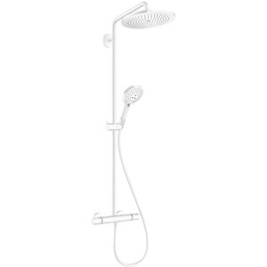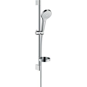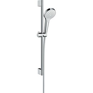 hansgrohe Croma Select S Ensemble de douche multi Numéro d'article 26561400 Type de jet: jet de massage, SoftRain, IntenseRain Changement de Select pratique Select bouton Select Taille de la pomme de douche: 110 mm pivotant côté douche contre la torsion gênante du tuyau de douche Angle d'inclinaison réglable de 90 °, le curseur pivote à gauche et à droite ainsi qu'en haut et en bas Débit maximum (à 3 bar): 16 l / min support mural en plastique chromé