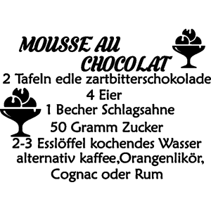 Des stickers cuisine pour votre déco ! Avec ce stickers pour la cuisine représentant un Sticker recette cuisine Mousse au chocolat vous pourrez décorer votre intérieur de manière originale et facile! Vous allez pouvoir donner une nouvelle vie à cette pièce si fréquemment utilisée ! Offrez un accuei