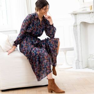 Taille• Longueur 125 cm environComposition• Voile jacquard 98% polyester, 2% fils métallisés• Doublure en crêpe 100% polyesterDescription• Col chemisier, boutonné devant• Manches longues élastiquées et volantées à la base• Ceinture à nouer sous passants (amovible : peut se porter sans ceinture pour un style confortable)• Smocks à la taille pour un effet blousant• Large volant à la base • Voile jacquard mixant fines rayures métallisées et imprimé fleuri• Doublure fond de robe à bretelles réglables• Longueur cheville