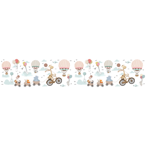 Sticker occultant pour vos fenêtres et votre salle de bain! Ce sticker représente les animaux et montgolfières dans les nuages. Les animaux sont : la girafe sur son vélo, l'hippopotame, le renard, le lapin, le pingouin et le singe dans les wagons, un lapin dans la montgolfière, un éléphant dans la