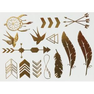 Tatouages temporaires “Motif indien” ! Démarquez-vous avec les tatouages "Indien"! Détails: -Tatouages temporaires -Fini métallisé doré -Divers motifs(plumes, flèches etc.) -Facile à appliquer et à enlever -Long durée (de 6 – 10 jours) -Convient à l'application sur les mains et sur le corps -Découp