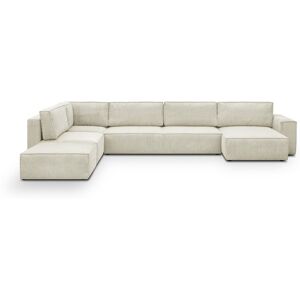 Canapé d'angle panoramique modulable 8 places avec pouf en velours côtelé beige Confort : équilibré : accueil moelleux soutien ferme Couleur : beige Revêtement : velours côtelé - certifié Oekotex Angle à gauche : se détermine lorsqu'on est face au canapé Structure en bois certifiée FSC Mousse HR 3