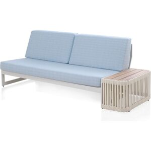 Canapé d’extérieur 3 places ultra-confortable avec petite table attenante en lames de PVC imitation bois, à la structure en aluminium blanc de 1,50 cm d’épaisseur. Le dossier et le siège sont confectionnés en polypropylène plat de 20 mm imitation rotin tressé couleur blanc cassé. Ce produit est agrémenté de coussins bleus en tissu respirant déhoussable 100 % acrylique avec fermeture éclair et finition anti-taches, hydrofuge et anti-UV pour un entretien facile. Le tressage est teinté dans la masse, avec un poids de 280 gr/m² et une forte résistance à la lumière (7/8). La housse du coussin est lavable à 30 °C. Ne pas utiliser de cycle d’essorage ni d’eau de Javel.