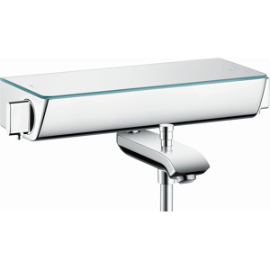 hansgrohe Ecostat Select mitigeur - numéro d'article: 13141000 - longueur 144 mm - 2 sorties - cartouche thermostatique SMTC, robinet d‘arrêt/inverseur - butée de confort à 40° C - limiteur de température réglable - débit du raccordement de la douchette sous 3 bar: 30 l/min - tablette en verre sécurit - pas de support de douchette intégré - avec alimentation d'eau isolée - clapet anti-retour intégré - avec silencieux - filtre inclus - entraxe: 150 mm ± 12 mm - type de raccordement: raccords S - dans le cas d'une installation existante en G ½ - l'adaptateur réf. 02026000 doit être utilisé
