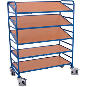 Chariot porte-bacs, mecano-soudé en tube et cornière d'acier. Etagères inclinables à 17° ou 32. Disponible avec ou sans plateau en mélaminé (décor hêtre et rebord de 10mm). Revêtement époxy bleu RAL 5010, résistant aux chocs et aux rayures. Roues à bandage en caoutchouc thermoplastique gris anti-...