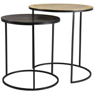 Set de 2 tables d'appoint gigognes rondes aluminium doré et noir - pieds ronds métal noir. Dimensions : 48,5 x 48,5 x 52 cm. Article en Aluminium et Métal. Collection indéfinissable tellement elle resplendit par la noblesse de sa matière. En un clin d'œil, cette gamme aux allures orientales illuminera votre intérieur avec sa couleur dorée et argentée. Ces superbes tables d'appoint noire et dorée sont très chics et élégantes à la fois. Ce set vous permet de les disposer l'une à côté de l'autre ou bien séparées comme vous le souhaitez… Elles donneront un petit côté original à votre pièce grâce à leurs pieds en métal asymétriques et leur cerclage texturé au niveau du plateau.
