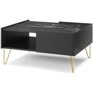 La table basse allie esthétique moderne et praticité, ce qui en fait un meuble parfait pour tout salon contemporain.Dotée de lignes épurées et d'une finition noire mate, cette table basse s'intègre facilement dans n'importe quel espace de vie, ajoutant une touche d'élégance et de sophistication.CaractéristiquesCadre en bois avec finition mate : la table basse est fabriquée avec un cadre en bois massif, recouvert d'une finition noire mate qui rehausse son design minimaliste.Pieds en métal doré : Les pieds fins en métal doré confèrent à la table basse un look sophistiqué et contemporain, tout en assurant stabilité et robustesse.Deux tiroirs spacieux : la table basse dispose de deux tiroirs intégrés, parfaits pour ranger des télécommandes, des magazines ou de petits objets, gardant votre espace bien rangé et organisé.Étagère ouverte : en plus des tiroirs, la table basse dispose d'un espace ouvert qui peut être utilisé pour exposer des livres, des objets de décoration ou pour accéder facilement aux accessoires du quotidien.Conception compacte : la table basse est conçue pour être fonctionnelle sans prendre trop de place, ce qui la rend idéale aussi bien pour les grandes pièces que pour les salons plus compacts.Découvrez tous les produits de la collection et complétez votre espace avec élégance !Matériel La structure du meuble est en bois lamellé de 16 mm avec chants en ABS résistantPieds en métal peint doré hauteur 20 cm Charnières en acier avec fermeture amortie à fermeture douceCouleurs disponibles NoirAssembléeLe produit est facile à assembler grâce au kit inclus.