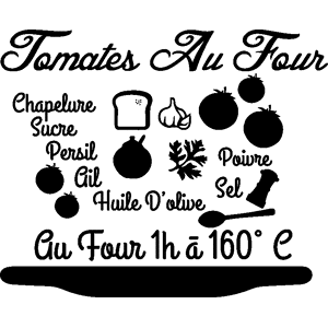 Des stickers cuisine pour votre déco ! Avec ce stickers pour la cuisine représentant un Sticker cuisine recette Tomates aux four vous pourrez décorer votre intérieur de manière originale et facile! Vous allez pouvoir donner une nouvelle vie à cette pièce si fréquemment utilisée ! Déguster vos petit