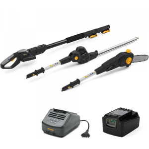 Activation à batterie, Poignée ergonomique, Tête avec inclinaison réglable, Pays de fabrication Chine, Configuration de l'élagueuse sur perche, Tige de rallonge- longueur 230 - 254180 - 230 cm, Équipement avec batterie, Matériau de la perche aluminium , Batterie incorporée, Configuration Sur perche, Type de moteur à batterie, Type de batterie lithium (Li-Ion), Voltage 20V, Ampères batterie 4Ah, Nombre de batteries 1, Ampères disponibles 4Ah, Perche à 2 parties (séparables), Type de transmission arbre rigide, Diamètre de la perche 26mm, Longueur de coupe utile 20cm, Type de lame standard, Pas de chaîne 3/8'', Lubrification du dispositif de coupe Automatique, Longueur de la lame 20cm, Tête taille-haie orientable, Écart des dents 26mm, Ø branche - Max 18mm, Ø Branche - Max 180mm, Mouvement des lames double lame inversé, Tendeur de chaîne rapide, Bouton rotatif démontage rapide guide/chaîne, Perche télescopique, Batterie partagée multi-outils, Démontage rapide chaîne, Poids 4.7kg