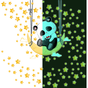 Des stickers phosphorescent pour votre déco ! Avec les stickers muraux phosphorescents et ce Stickers phosphorescents panda balançoire de lune et 130 étoiles, vous vous approprierez enfin votre intérieur ! Ce sticker phosphorescent doit être exposé à la lumière pendant 1h pour pouvoir briller 5h. D