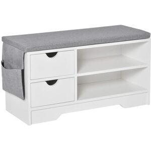 Description:Ce magnifique banc à chaussures est le meuble de rangement idéal pour ranger vos chaussures et diverses affaires. Pratique, vous pouvez également vous asseoir sur ce meuble grâce au coussin rembourré de mousse haute densité pour mettre vos chaussures.caractéristique:· Banc à chaussures meuble à chaussures 2 en 1 très pratique vous permettant de méler l'utile à l'agréable · Banc à chaussures style contemporain bicolore blanc et gris mélant sobriété et élégance pour sublimer votre intérieur · Taille compacte, idéale pour installation dans votre entrée, dressing, ou même chambre · Nombreux rangements : 2 tiroirs, 2 étagères et 1 poche latérale · Banquette revêtement lin avec garnissage mousse haute densité pour un véritable confort d'assise · Fabriqué à partir de panneaux MDF pour une utilisation durable · Peut accueillir 4 paires de chaussures au total · Montage facile et rapide à l'aide de l'outillage et du manuel d'assemblage illustré fournisSpécification:· Couleurs : blanc, gris · Matériaux principaux : MDF classe E1, rembourrage mousse, lin (100% polyester) · Dim. totales : 80,5l x 30,5P x 43,5H cm · Dim. rangement interne tiroir : 22l x 23P cm · Dim. étagère : 48,3l x 28P x 14H cm · Dim. coussin d'assise : 80,5L x 30,5l x 4H cm · Dim. poche latérale : 26,5L x 17l cm · Charge max. recommandée : 160 Kg (au total), 140 Kg (banc), 6 Kg (par étagère), 3 Kg (tiroir) · Livraison effectuée en un colis · Réf. : 837-165contenu du colis: