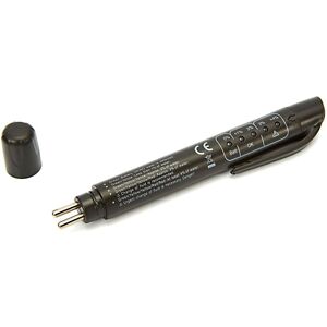 Mesurez simplement et rapidement l’état de la qualité de votre liquide de frein avec ce testeur numérique professionnel HBM. En forme de stylo, il indique sur cinq LED intégrées le pourcentage d’eau présent. Vous savez ainsi immédiatement s’il faut compléter ou remplacer le liquide. La quantité correcte de liquide de frein est essentielle à la sécurité, d’où l’importance de contrôles réguliers. Ce testeur numérique convient aussi bien aux ateliers professionnels qu’aux automobilistes. Facile à utiliser : les LED indiquent instantanément la nécessité d’une intervention. L’appareil mesure l’humidité jusqu’à 85 %. Le boîtier précise en anglais l’interprétation de chaque LED.