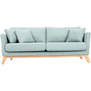 Le canapé OSLO emprunte le meilleur au style nordique !Pieds inclinés en bois clair, revêtement aussi doux au toucher qu'agréable au regard, formes fonctionnelles : ce canapé scandinave en tissu bleu foncé séduit par son caractère chaleureux.Formant un duo sans fausse note, le revêtement en tissu (100% polyester) et le piètement en hévéa massif, subliment avec simplicité les lignes de cet élégant canapé bleu foncé. Avec ses dimensions totales L179 x P80 x H81 cm, ce petit canapé 3 places deviendra sans nul doute la pièce maîtresse de votre pièce de vie, sans grignoter l'espace ni gêner à la circulation. Grand favori des salons 100% cocooning, OSLO et ses galbes accueillants invitent littéralement au lâcher-prise ! Garnis d'une agréable mousse, les coussins d'assises, de dossier, et trois petits coussins d'appoint, sont tous habillés d'une housse à fermeture glissière. Aussi esthétique que pratique, ce canapé 3 places déhoussable se tient prêt à accompagner votre quotidien et pour longtemps !Formez un tandem de charme en associant le canapé scandinave bleu foncé OSLO à une table basse en bois clair.Canapé scandinave déhoussable 3 places en tissu bleu foncé et bois clair OSLO livré prêt à assembler. Montage simple, seuls les pieds sont à fixer.