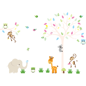 Des stickers animaux pour votre déco ! Avec les stickers muraux animaux multicolore et ce Stickers animaux amis dans la jungle, vous vous approprierez enfin votre intérieur ! Dimension du sticker : La planche de 60 x 80 cm, le sticker arbre mesure 45 x 75 cm - le sticker éléphant mesure 21 x 31 cm