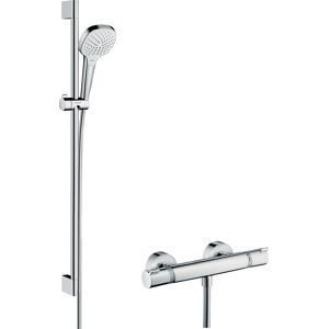 hansgrohe Croma Select E Combi set de douche 27082400 Numéro d'article : 27082400 Couleur: blanc / chrome Dimensions: (LxHxP): 110 x 959 x 110 mm Composé de: Vario à main Croma Select E Vario avec toboggan Unica rail de Unica Croma avec Isiflex douche Isiflex Comfort Select Ecostat Comfort Select Ecostat Comfort Select Douchette à main avec toboggan: 3 types de pulvérisation : Rain, TurboRain, IntenseRain Select pratique Select bouton Select Dimensions: 110 x 110 mm avec une distribution d'eau optimale ( performances XXL ) La surface chromée est protégée par des canaux d'eau internes séparés avec QuickClean pour une élimination rapide du calcaire en essuyant les buses en silicone avec passoire rincable L'angle de la douchette peut être ajusté de 45 ° débit maximum (à 3 bar): 15 l / min Barre de douche avec flexible de douche: Tuyau de douche résistant aux plis, flexible et facile à nettoyer avec pivot sur le côté de la douche pour éviter une torsion gênante du tuyau de douche Longueur du tuyau de douche: 1600 mm Hauteur du rail de douche: 959 mm Distance de perçage: 915 mm Thémostat: La douchette est activée en la tournant avec bouton Ecostop pour réduire le volume d'eau à 10 l / min sur simple pression d'un bouton température de l'eau constante même avec une pression d'eau fluctuante Le verrou de sécurité à 40 ° C protège contre les températures accidentellement trop chaudes (protection contre les brûlures) avec fonction de sécurité pour prérégler une température maximale avec clapet anti-retour