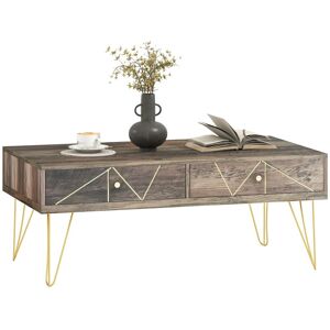 Description:La table basse de HOMCOM, le panneau brun combiné avec des lignes dorées peintes à la main ajoutent plus de charmes à votre maison. La table basse de rangement est faite de panneaux de particules classe E1 et de pieds en métal, ce qui est durable. La grand plateau et 2 tiroirs vous offrent suffisamment d'espace pour ranger des livres et des magazines, des tasses à café et d'autres articles.caractéristique:● Panneau brun veinage combiné avec des lignes dorées peintes à la main met en valeur le luxe; ● Forme à la mode et élégante, avec un bon effet décoratif, très adapté au salon, à la chambre, etc...; ● Structure ferme et stable avec panneaux de particules classe E1 et pieds en métal de haute qualité; ● Le grand plateau et 2 tiroirs offrent un grand espace de rangement, adapté pour placer des livres, des magazines, des tasses à café et d'autres articles; ● Surface lisse, facile à nettoyer et à entretenir; ● Assemblage requisSpécification:● Couleur principale : brun; ● Matériaux principaux : panneaux de particules classe E1, métal; ● Dim. totales : 110L x 59l x 42H cm; ● Dim. rangement interne tiroir : 46,8l x 31,3P x 6H cm; ● Hauteur pieds : 26 cm; ● Charge max. recommandée : 50 Kg; ● Réf. : 833-805contenu du colis: - table basse; - Manuel d'assemblage