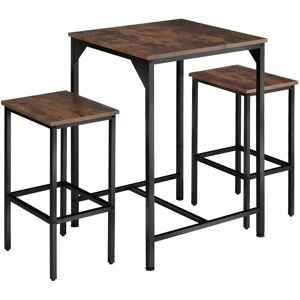 Des formes distinctives et un mélange de matériaux réussi caractérisent l'apparence de l'ensemble de bar Inverness de tectake, composé de trois pièces. Le bois chaud et l'acier froid ont été élégamment combinés pour créer le look typique du style industriel de cet ensemble de meubles. Les pieds en plastique réglables en hauteur de la table et des tabourets préservent le sol et augmentent la stabilité. Grâce à son design délibérément sobre et à ses petites dimensions de base, le groupe de meubles sans fioritures s'adapte facilement à l'ameublement respectif et contribue à une ambiance élégante. Caractéristiques Techniques: TableDimensions totales (LxlxH) : env. 60 x 60 x 91 cmDistance entre le cadre transversal inférieur et le sol : env. 12 ou 24 cmÉpaisseur du panneau de particules : env. 1,5 cmCadre en acier (lxP) : env. 2,5 x 2,5 cmRéglage des pieds en plastique : env. 1,5 cmCapacité de charge : 75 kgPoids : env. 8,4 kgMatériaux : panneau de particules, acier revêtu par poudre, polyéthylèneTabouretDimensions totales (lxPxH) : env. 40 x 30 x 66 cmDistance entre le cadre transversal inférieur et le sol : env. 24 cmÉpaisseur du panneau de particules : env. 1,5 cmCadre en acier (lxP) : env. 2 x 2 cmRéglage des pieds en plastique : env. 1,5 cmCapacité de charge : 120 kgPoids : env. 3,5 kgMatériaux : panneau de particules, acier revêtu par poudre, polyéthylène