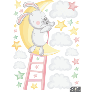 Des stickers animaux pour votre déco ! Avec les stickers muraux animaux multicolore et ce Stickers lapin rêveur dans les étoiles, vous vous approprierez enfin votre intérieur ! Dimension du sticker : La planche de 65 x 50 cm, le sticker lapin s'accrochant à la lune sur l'échelle mesure 65 x 30 cm L