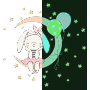 Des stickers phosphorescent pour votre déco ! Avec les stickers muraux phosphorescents et ce Stickers phosphorescents lapin assis sur la lune et 30 étoiles, vous pourrez enfin décorer l'intérieur de votre chambre à votre guise ! Ce sticker phosphorescent doit être exposé à la lumière pendant 1h pou