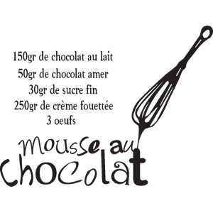 Des stickers cuisine pour votre déco ! Avec ce stickers pour la cuisine représentant une recette " Mousse au chocolat " vous pourrez décorer votre intérieur de manière originale et amusante ! Vous allez pouvoir donner une nouvelle vie à cette pièce si fréquemment utilisée ! Où coller cet autocollan