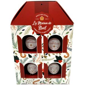 Dimensions• Coffret : dim. 16 x 18 x 7 cm• Bougie : Ø 5 cm, haut. 6 cmComposition• Coffret papier carton• Bougie en cire, mèche en coton• Pot en verreDescription• Coffret de 4 bougies, forme maisonnette• Parfum cookie cannelle• Bougies 1 mècheConsignes de sécurité :• Ne pas laisser la bougie allumée la nuit et ne pas quitter la pièce lors de la combustion de la bougie• Brûler la bougie hors de la portée des enfants et des animaux domestiques• Ne pas faire brûler les bougies à proximité d’un quelconque objet susceptible de s’enflammer