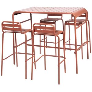 Les + produit :Ce set comprend une table et 4 chaises AmeliaEvacuation simple de l'eau de pluieTraitement anti rouilleTable de jardin en acier traité par électrophorèseChaises empilablesUne table de jardin au design intemporel Cette table haute 4 places en métal est parfaite pour votre jardin ou votre balcon terrasse. Son design intemporel se mariera et s'adaptera à tout style d'aménagement extérieur. La table Amelia est parfaite pour passer des moments conviviaux avec vos proches. Profitez de l'air frais de votre extérieur avec cette magnifique table haute !Assorties à la table, les chaises hautes Amelia apportent un vrai plus à votre décoration de jardin, avec leur belle structure en acier et leur design intemporel. Les bords arrondis et les lattes de l'assise et du dossier rendent ces chaises originales.Robuste et antirouilleCet ensemble est parfait pour ceux qui recherchent une table durable et esthétique. Doté d'un traitement antirouille, la table et les chaises peuvent être utilisés en extérieur sans avoir à craindre que l'humidité ou la pluie ne les abîme. Les fentes permettent à l'eau de s'évacuer facilement par temps de pluie, et les chaises sont empilables pour un rangement facile. Dimensions et caractéristiques Table :Matière : Acier Forme : RectangulaireNombre de places : 4A monter (notice fournie)Usage domestiqueGarantie 2 ans Dimensions : Table : 70 x 70 x H 95cm Poids : 10,5kgChaises (x4) : Déjà montées, prêtes à utiliser.Usage domestique.DimensionsChaise : L44 x P41 x H85cmPoids : 4kg