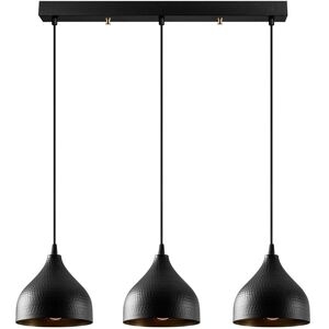 Bande de plafond pour éclairer les tables à manger. Bande composée de trois écrans métalliques suspendus répartis en ligne. De cette façon, la lampe est parfaite pour être installée sur un plan de travail en îlot ou sur une table rectangulaire, en apportant de la lumière. Bande de plafond Asney pour salons, salles à manger et cuisines modernes.Dimensions : Hauteur Max. 114 cm. Longueur 68 cm. Largeur 18 cm.Fiche technique Éclairage 3 x E27 Max. 40W. Ampoules non incluses Caractéristiques Hauteur maximale : 114 Cm. Longueur : 68 cm. Largeur : 18 cm. Câble : 90 cm. Finition : Noir (intérieur doré) Matériau : Métal Autres données Degré IP : IP20 Tension : 230 V. Fréquence : 50/60 Hz. Wonderlamp est une marque visant à proposer des produits indispensables en matière d'éclairage LED. Il s’agit d’une sélection minutieuse et détaillée de différentes options conçues pour un éclairage complet de la pièce. Wonderlamp occupe une position forte sur les marchés les plus influents, offrant un éclairage de qualité à un prix compétitif. Wonderlamp s'est imposé comme une marque de référence et très fiable sur le marché en ligne grâce à la qualité de ses produits. Une marque leader, digne de confiance et avec toutes les garanties.