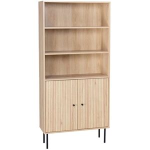 Les + produit :- 2 portes- 3 niveaux- 5 étagères- Aspect bois rainuré et piètement métal noirAvec cette étagère, donnez un look contemporain à votre intérieur. Son effet bois rainuré et ses subtiles touches de métal noir se marient à merveille pour vous proposer un meuble qui se fond dans tous les intérieurs. Dans une chambre ou dans un salon, elle se démarquera par son élégance implacable. En plus de sublimer votre pièce, cette bibliothèque saura vous surprendre par sa fonctionnalité. Avec ses trois étagères supérieures, plus besoin de se prendre la tête pour ranger ses livres, ses documents importants ou encore ses jeux de société. Ses deux portes en bois rainuré vous permettront de cacher les objets les plus encombrants grâce aux deux étagères supplémentaires dissimulées. Nombre de portes : 2Nombre d'étagères : 5Nombre de pieds : 4Nombre de poignées : 2Bibliothèque : L 80 x P 29 x H 170,5cmEtagères : L 76,9 x l 27,2cm / L37,5 x l 27,5cmHauteur entre les étagères : 29,8cm / 28cmPieds: H 19cmPoids net : 32,7kgPoids max supporté total : 40kgPoids max supporté par étagère : 5kg