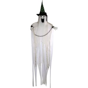 La figurine fantôme suspendue au sourire diabolique est le complément idéal à vos décorations effrayantes. Avec son rire maniaque et ses yeux rouges clignotants à LED, le fantôme suspendu d'Europalms accueillera vos invités lors de votre fête d'Halloween ou de votre soirée à thème. Il est tellement en colère que tout son corps vibre, mais heureusement, ses mains maigrichonnes sont menottées par des menottes médiévales. Celles-ci sont reliées par une longue chaîne qui le maintient bien en place. Le fantôme est vêtu d'une robe à plusieurs couches effilochée, blanche et beige. Il porte également un chapeau pointu à carreaux avec un large bord. Le nœud, qui sert à suspendre la figurine, y est également fixé. L'animation de la figurine suspendue est activée par un microphone intégré ou une commande manuelle filaire. Ses bras peuvent être facilement pliés pour prendre la forme souhaitée.Fantôme animé avec chapeau pointu pour votre décoration d'Halloween Alimenté par une batterie/un bloc-batterie, Yeux rouges clignotants, Effets sonores, Figurine avec effet de mouvement, Durée de l'animation jusqu'à 25 secondes, Bras malléables, Contenu de l'emballage 1 figurine, 1 manuel d'utilisation, Alimentation électrique: 4,5 V CC, Classification IP: IP20, Connexion électrique: Batterie/bloc-batterie, Batterie: 3 piles Mignon (AA) (non incluses), Effet: Yeux rouges clignotants, effets sonores, figurine avec effet de mouvementVia un capteur acoustique ou un bouton, durée maximale de 25 secondes., Configuration: Bras malléables, Position debout/fixation: Boucle (corde), Couleur: Blanc, Dimensions: Largeur: 70 cmProfondeur: 20 cmHauteur: 200 cm, Poids: 0,71 kg