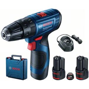 Perceuse-visseuse à percussion sans fil GSB 120-LI Bosch fait partie de la gamme d'outils alimentée par une batterie lithium-ion 12V Flexible Power System • 3 modes:perçage à percussion, sans percussion et vissahge • 2 vitesses: performances optimales dans tous les modes • Réglage de l'embrayage: vissage précis • LED: illumine le lieu de travail • Poignée confortable: prise ergonomique et sûre • Commutateur de rotation: changement rapide de la rotation droite et gauche pour un retrait facile des vis • Alimenté par une batterie 12V Li-Ion Flexible Power System: fonctionnement sans fil gratuit et efficace Ce produit comprend • 2 batteries GBA 12V 2.0Ah 1600Z0002X • Chargeur CV GAL 1210 • Valise à outils>