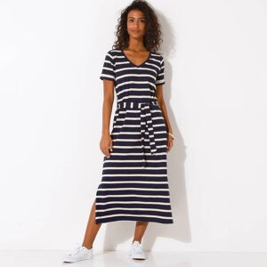 Taille• Longueur 115 cm environComposition• Maille jersey 100% cotonDescription• Rayures en fils teints pour un look impeccable• Col V• Manches courtes avec revers• Ceinture amovible à nouer à la taille (sous passants)• Grande fente coté• Coupe droite non moulante• Longueur facile à vivre• Maille fluide de belle qualité