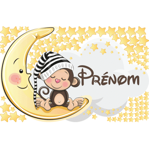 Des stickers Prénoms Personnalisables pour votre déco ! Ajoutez votre prénom personnalisable avec ce sticker mural ! Tous les caractères sont importants : majuscules, minuscules, accents, etc. Avec les stickers muraux prénoms personnalisables et ce Sticker personnalisable prénom singe sur la lune,
