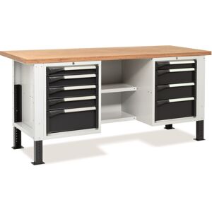 Etabli d'atelier PROFIS modèle 5, équipé de : > 1 Plateau bois en multipli hêtre épaisseur 40 mm. supportant une charge maxi de 1000 kg (C.U.R) Structure fabriquée en tôle d’acier de première qualité > Pieds réglables en hauteur de 740 à 1115 mm (au pas de vis de 25 mm) > 1 bloc 5 tiroirs avec fermeture à clés, comprenant : 1T75 + 3T100 + 1T200 mm, extension flexible à 92%, 96% ou100% - Dim. hors-tout bloc :