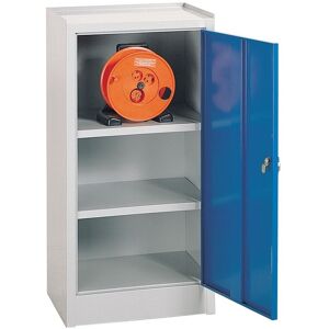 Armoire d'atelier métallique AT41 version 2 Modèle bas avec structure monobloc soudée équipé de > 1 porte battante. > 2 tablettes réglables. Charge maxi par tablette 40 kg. > Rebord supérieur sur 3 côtés. Points forts : > Finition peinte soignée. Coloris gris RAL 7035 et porte bleu RAL 5010 (Peinture cuite au four) > Fermeture à clé double sécurité. > Niveaux réglables en hauteur tous le