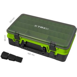 Delphin TBX EasyDuo est une boîte pratique avec la prise semblable au celle d'une mallette et avec deux compartiments séparés. Il est possible de la porter comme une mallette. Il sert très bien pour déposer les leurres et d'autres accessoires de pêche. Le sac a des clips par lesquels il est possible d'ouvrir les compartiments. Ils sont en couleur noire et vert clair et le couvercle en gris transparent. Informations techniques : Dimensions : 400x290x120 mm Nombre des compartiments (boîte) : 10 Dimensions d'un compartiment : 1x(36x19x6,5 cm), 3x(36,5x6x5 cm), 3x(12x6x5 cm), 3x(12x6x6,5 cm) Le nombre des compartiments insérés : 17
