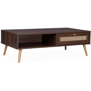 Les + produit Design rétro et élégantAlliance du décor bois et du cannage Pieds compas vintage Après plus de 10 ans d'expérience dans l'équipement extérieur, c'est tout naturellement (avec l’aide de nos clients inspirés et collaborateurs motivés) que la gamme Alice's Home spécialisée dans le mobilier et l’équipement d'intérieur voit le jour, en gardant toujours les mêmes promesses.Notre collection Bohème a été pensée pour donner une touche naturelle et vintage à votre intérieur avec des meubles qui allient cannage et décor bois. Le caractère du décor bois se marie parfaitement avec la simplicité du cannage qui habille les meubles avec élégance. Table basse, meuble de TV, table de chevet... Cette collection vous propose une sélection de meubles de rangement pour aménager votre intérieur tout en légèreté. Cette table basse est parfaite pour vos apéritifs entre amis, prendre votre café et pour tous vos moment conviviaux. Elle apportera une touche de légèreté au centre de votre salon. Elle est équipée d'un espace de rangement et d'un tiroir pour ranger vos affaires (magazines, télécommandes...) Pour un design naturel et authentique, la structure est en panneaux stratifiés. Le tiroir en cannage et les pieds compas apportent une touche vintage et élégante au meuble. Panneaux : Panneaux stratifiésPieds : Panneaux stratifiésTiroir : Cannage Dimensions produit : L110 x l59 x H39cmPlateau : L110 x l59cmDimensions poignée : 1.8x2.4cmEpaisseur des panneaux : 1.5cmEspaces de rangement : L106,5 x P18,2 x H15,5cm /L52,5 x P39,3 x H15,5cmTiroir (extérieur) : L52 x H15cmTiroir (intérieur) : L48 x P31,5 x H9,5cmPieds : Ø2 x H16cmPoids : 20.9kgPoids max supporté : 50kg