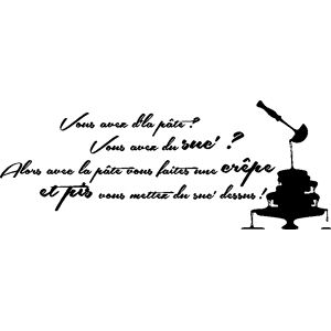 Des stickers cuisine pour votre déco ! Avec ce stickers pour la cuisine représentant un Sticker recette citation cuisine crêpes Vous avez d'la pâte? vous pourrez décorer votre intérieur de manière originale et facile! Vous allez pouvoir donner une nouvelle vie à cette pièce si fréquemment utilisée