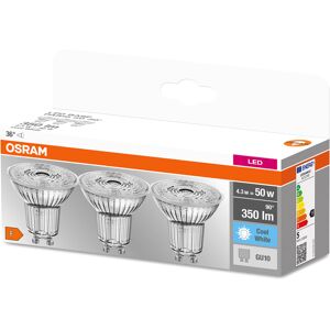 Lampes LED à réflecteur PAR16, culot à broches. Caractéristiques produit: Lampes LED disponibles pour tension secteur, Non gradable, Culot: GU10, Lampes sans mercure, Avantages produits: Idéal pour un éclairage spot économique, Alternative aux lampes halogènes tension secteur, Très faible consommation d’énergie, Pas d'émission d'UV ni d'IR dans le faisceau lumineux, Résistant aux chocs et aux vibrations grâce à la technologie LED, Management thermique professionnel, Domaines d'application: Éclairage spot pour l'accentuation, Applications domestiques, Éclairage spot d'objets sensibles à la chaleur tels que aliments, usines, etc, Utilisation en extérieur, uniquement dans des luminaires appropriés, Comme spotlight pour le balisage de chemins, de portes, d'escaliers, etc, Éclairage d'accentuation et d'ambiance dans toute la maison, Toutes les pièces domestiques, en particulier là où les lampes sont visibles, Données techniques: Longueur: 52 mm, Largeur: 50 mm, Diamètre: 50 mm, Poids net: 37 g, Socle: GU10, Tension nominale: 240 V, Courant nominal: 38 mA, Puissance de mesure: 4,30 W, Consommation d'énergie: 5 kWh/1000, Température de couleur: 2700 K, Couleur de la lumière: Blanc chaud, Angle de rayonnement: 36 °, Faisceau lumineux: 350 lm, Puissance lumineuse: 600 cd, Restitution des couleurs: 80 CRI, Durée de vie: 10000 h, Cycles de fonctionnement: 100000, Classe d'efficacité énergétique: F, Avec variateur de lumière: Non, Couleur: Clair, EAN: 4058075090460