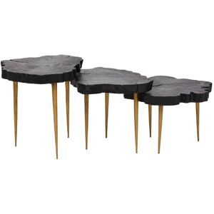 Les trois tables basses gigognes FLEURS apportent une touche bohème à votre décoration. Fabriquées en bois massif de lychee noirci, chaque table conserve la forme naturelle du tronc, et leurs pieds en métal finition laiton ajoutent un charme vintage. Pratiques et élégantes, elles peuvent être utilisées ensemble ou séparément.Matériaux : Bois massif de lychee noirci, piètement en métal finition laiton. Style : Bohème. Dimensions produit : L 50 x H 45 x P 50 cm, L 40x H 40 x P 40 cm, L 35 x H 35 x L 35 cm. Montage : Meuble avec montage.