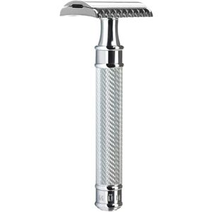 La tête de rasoir - lame classique - peigne fermé Design noble et précision mécanique. Le rasoir MÜHLE à peigne fermé promet un rasage de près et en même temps doux. Contrairement au rabot à peigne ouvert, le bord en mousse ne présente aucune denture. En combinaison avec un angle de lame légèrement plus raide, ce rabot permet une technique de rasage très douce qui convient parfaitement aux débutants ayant un peu d'entraînement. Les contours les plus fins et les lignes les plus nettes, par exemple à la base de la barbe, sont néanmoins une affaire d'honneur. Le matériau - métal, or rose Délicatement chatoyant, plus doux dans son effet, mais durable et résistant. La couleur douce du manche recouvert d'or rose s'harmonise avec la fine ciselure. largeur : 42 mmLongueur : 94 mm TRADITIONAL Pour les experts et ceux qui veulent le devenir : Le rasage sur peau humide avec un rasoir de la série TRADITIONAL nécessite une dose supplémentaire de doigté. Mais avec un peu de pratique, ce rituel matinal deviendra bientôt un plaisir indispensable - justement parce qu'il demande un peu de temps libre. MÜHLE fabrique l'accessoire de rasage classique avec des lames interchangeables en deux variantes : Le rabot à peigne ouvert permet une technique de rasage très directe pour les experts aux exigences les plus élevées. Le rasage à peigne fermé est plus doux, mais tout aussi précis et minutieux dans le résultat. Le plus beau des rituels de soin est bien entendu le blaireau de rasage adapté. Il est classiquement en métal chromé, au choix en noir, ou un peu plus exclusif avec un alliage d'or rose.
