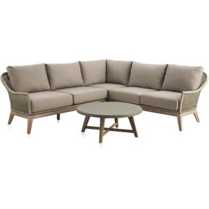 Salon d’angle d’extérieur composé de 3 pièces. Grand canapé aux dimensions 230 x 80 x 80 cm, canapé latéral de 160 x 80 x 80 cm et table basse ronde avec plateau en ciment léger couleur taupe d’un diamètre de 90 cm. La base des canapés est en bois d’acacia massif légèrement patiné, sur laquelle repose une structure en aluminium avec cordes tressées couleur taupe. Les coussins sont de couleur taupe. Ceux de l’assise sont en tissu déhoussable 100 % acrylique hydrofuge et résistant à la lumière, et présentent une épaisseur de 15 cm, dont la densité moyenne vous garantit un confort maximal. Les coussins du dossier sont plus doux pour plus de commodité. Pour une plus grande durabilité des housses, il est recommandé de les laver à la main et à l’eau froide. Montage ultra-rapide à l’aide de la visserie fournie avec le meuble.
